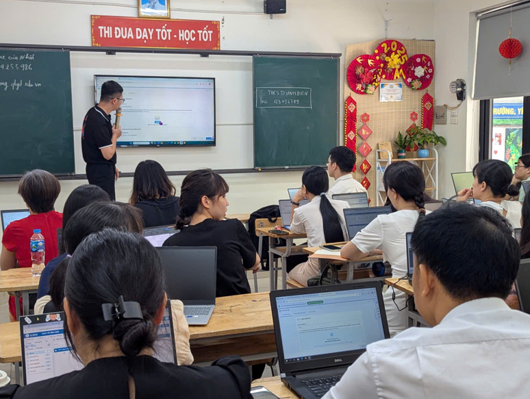- Nội dung trọng tâm, nổi bật trong tuần lễ hưởng ứng đó chính là Nâng cao năng lực CNTT trong việc số hóa hồ sơ cá nhân GV phục vụ cho công cuộc chuyển đổi số trong giáo dục. Nhận thức được rõ tầm quan trọng của việc chuyển đổi số gắn với việc học tập suốt đời, 100% cán bộ, giáo viên, nhân viên trong nhà trường đã tích cực tham gia tập huấn sử dụng các nền tảng số, các phần mềm quản lý hồ sơ để từng bước số hóa hồ sơ cá nhân của giáo viên. Nếu như trước đây, giáo viên khi đến trường luôn phải mang theo khoảng 5-6 đầu sổ cá nhân thì giờ đây những đầu sổ ấy đã được số hóa thành các file, được cất giữ trong các folder trên phần mềm cơ sở dữ liệu của hệ thống quản lý hồ sơ điện tử; hệ thống học bạ số và sổ điểm số.